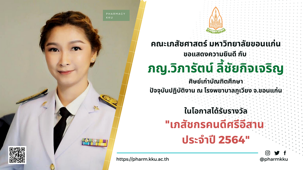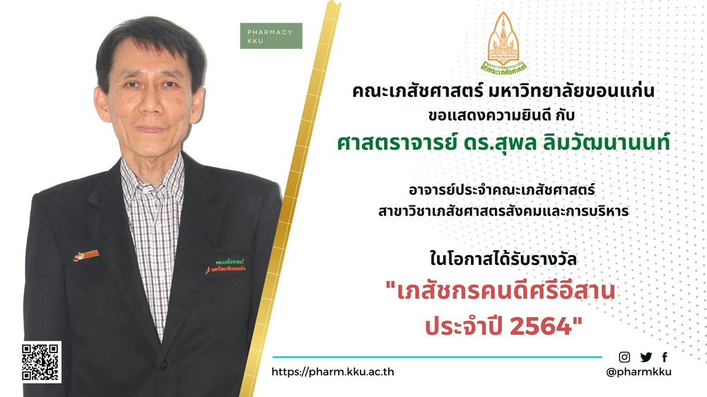 คณะเภสัชศาสตร์ มหาวิทยาลัยขอนแก่น ขอแสดงความยินดีกับ ศ.ดร.สุพล ลิมวัฒนานนท์ ศ.ภก.ดร.สุพล ลิมวัฒนานนท์ อาจารย์ประจำสาขาวิชาเภสัชศาสตรสังคมและการบริหาร คณะเภสัชศาสตร์ มหาวิทยาลัยขอนแก่น ภญ.ศศิธร เอื้ออนันต์ (ศิษย์เก่ารุ่นที่ 11) ปัจจุบันปฏิบัติงาน ณ สำนักงานสาธารณสุขจังหวัดขอนแก่น และ ภญ.วิภารัตน์ ลี้ชัยกิจเจริญ (ศิษย์เก่าบัณฑิตศึกษา) ปัจจุบันปฏิบัติงาน ณ โรงพยาบาลภูเวียง จ.ขอนแก่น ในโอกาสได้รับรางวัล " เภสัชกรคนดีศรีอีสาน ประจำปี 2564 "