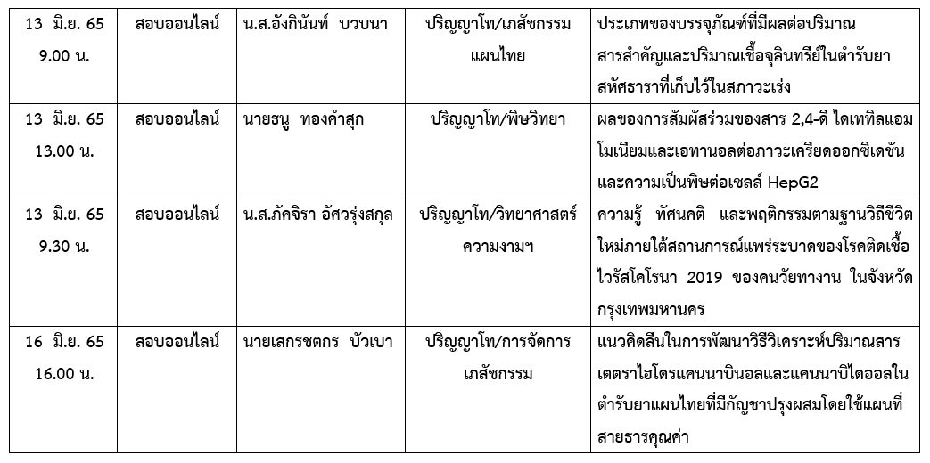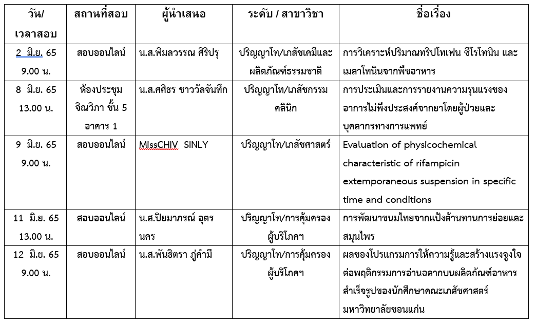 คณะเภสัชศาสตร์ มหาวิทยาลัยขอนแก่น ขอเชิญ คณาจารย์ นักศึกษาระดับบัณฑิตศึกษาและผู้สนใจทุกท่าน เข้าร่วมฟังการสอบวิทยานิพนธ์ / การศึกษาอิสระ