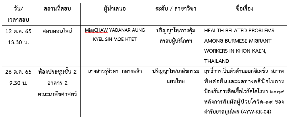 คณะเภสัชศาสตร์ มหาวิทยาลัยขอนแก่น ขอเชิญ คณาจารย์ นักศึกษาระดับบัณฑิตศึกษาและผู้สนใจทุกท่าน เข้าร่วมฟังการสอบวิทยานิพนธ์ / การศึกษาอิสระ