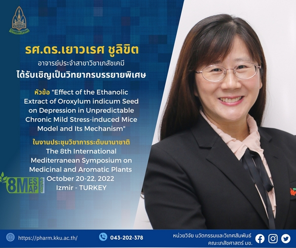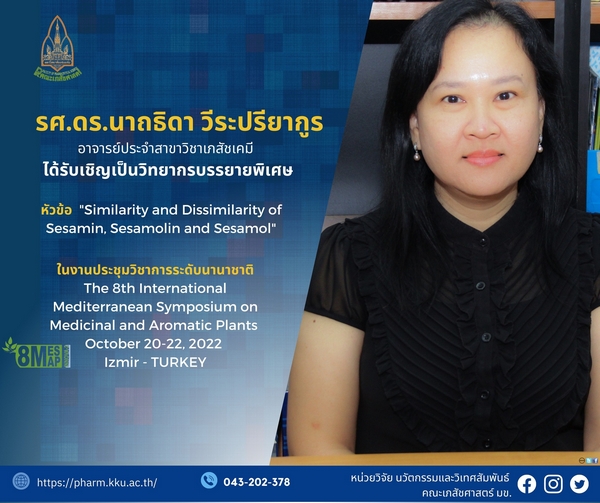รศ.ดร.เยาวเรศ ชูลิขิต และ รศ.ดร.นาถธิดา วีระปรียากูร อาจารย์ประจำสาขาวิชาเภสัชเคมี คณะเภสัชศาสตร์ ได้รับเชิญเป็นวิทยากรบรรยายพิเศษ ในงานประชุมวิชาการระดับนานาชาติ The 8th International Mediterranean Symposium on Medicinal and Aromatic Plants ระหว่างวันที่ 20 – 22 ตุลาคม 2565 ณ เมือง Izmir ประเทศตุรกี